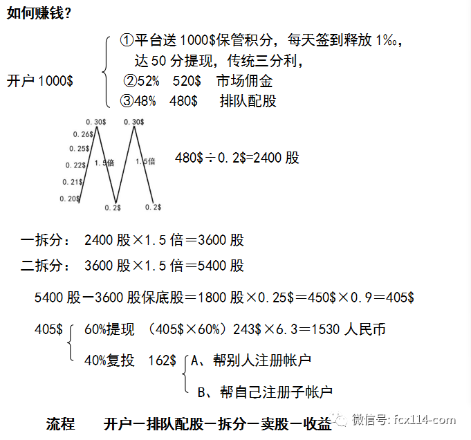 3.全球分红:100$为一个分红权,1000$为10个分红权, 分红来源: ①公司主点位;②罚没金(1.5倍)
