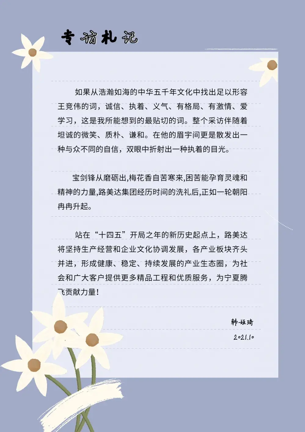 “父母亲勤劳与忠厚朴实的秉性,从小起就影响着我,教育着我,成了我这辈子取之不尽的精神食粮。要创造幸福生活,全靠自己的双手,这也是我人生最早的领悟。创业之初,我认识了一些干工程的朋友,于是就想着‘兄弟同心,其力断金’,大家一起同心协力做出点成绩,一方面兄弟们可以改善家庭生活质量。另一方面,我想闯一闯,体会不一样的人生。时至今日,我初衷不改,企业发展的同时也给兄弟们带来了更好的生活,好多当初跟我一起从家乡走出来的兄弟在银川安家扎根,把父母也接到了城里共享天伦,我觉得这是我除了路美达以外的另一项成绩和骄傲。”回想创业之初,王竞伟笑着告诉我。我从他的笑容中仿佛看到了那段艰难岁月,他和兄弟们一步一个脚印,不忘初心,砥砺奋进的身影。