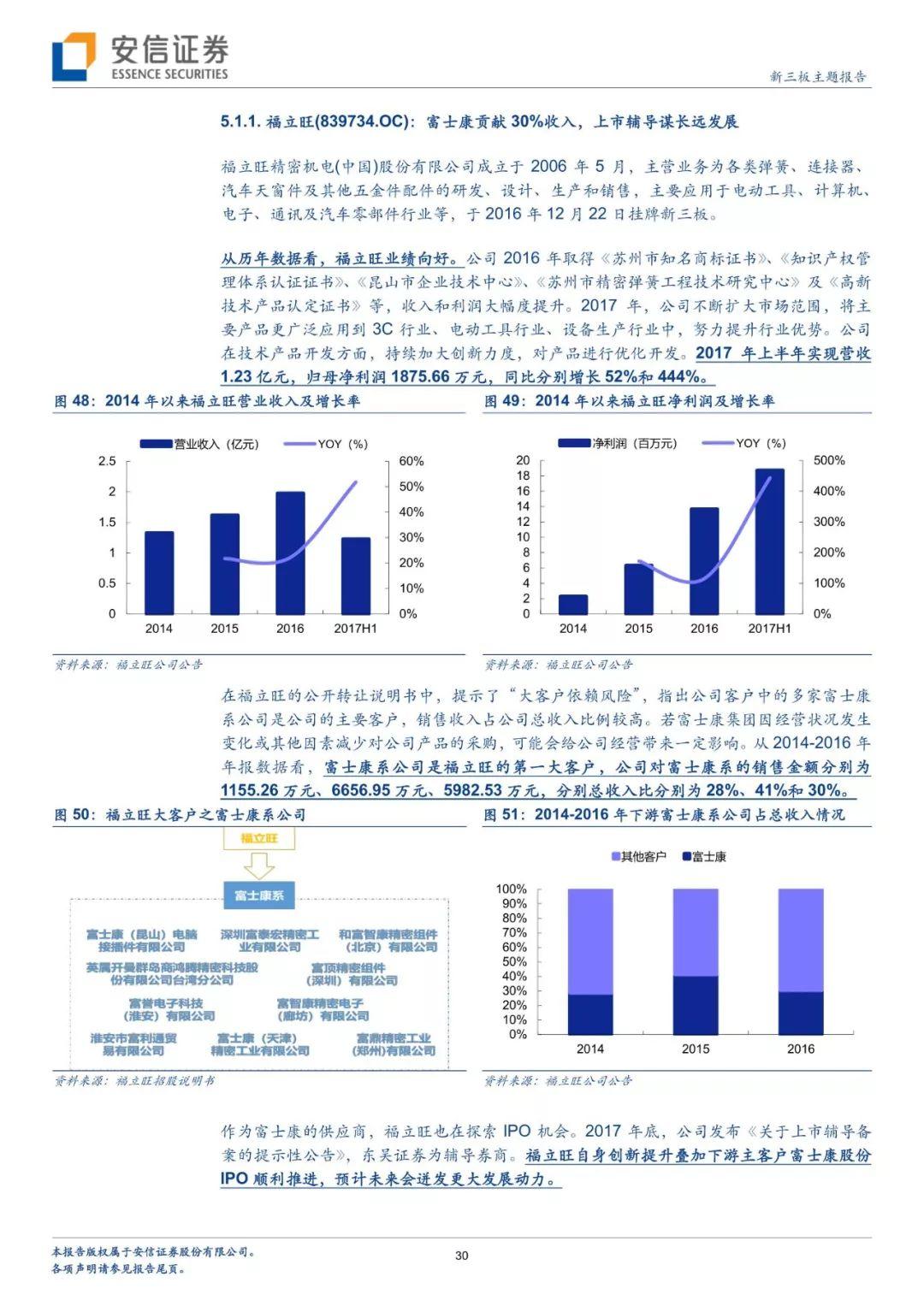 。聚焦新三板:(1)福立旺(839734.OC) 2017H1营收、净利润同增52%、444%,自身创新提升叠加下游主客户富士康股份IPO顺利推进,预计未来将迎高增长;(2)三泰特材(838008.OC):供应商与客户身份叠加,部分高管在富士康系有过就职经历,公司业绩与富士康系发展呈联动变化,预期公司将迎来协同共进;(3)徐工信息(872437.OC):推出国内首个工业互联网平台Xrea,致力于研发并向物联网、智能制造、两化融合(信息化+工业化)业务倾斜,有望迎来发展关键期。