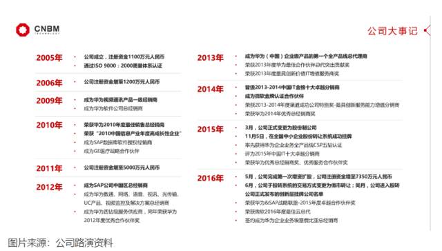 在软件及云计算服务业务方面,公司获得 SAP 亚太区 2016 年度最佳总代奖,成为 SAP 亚太区有记 录以来第一家下单突破 1500 万欧元的合作伙伴。2017 年 7 月,公司受邀赴美参加召开 2017 微软全球合 作伙伴大会(Microsoft Inspire),并荣获了“中国区 Top CSP Indirect Provider”大奖。2017 年,华为公司大力推出公有云产品,公司率先获得了华为公司公有云标准经销商资质,并首批通过华为云计算认证级解 决方案合作伙伴(CSSP)认证。