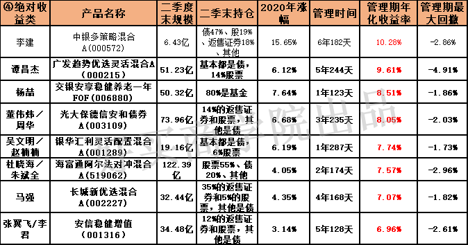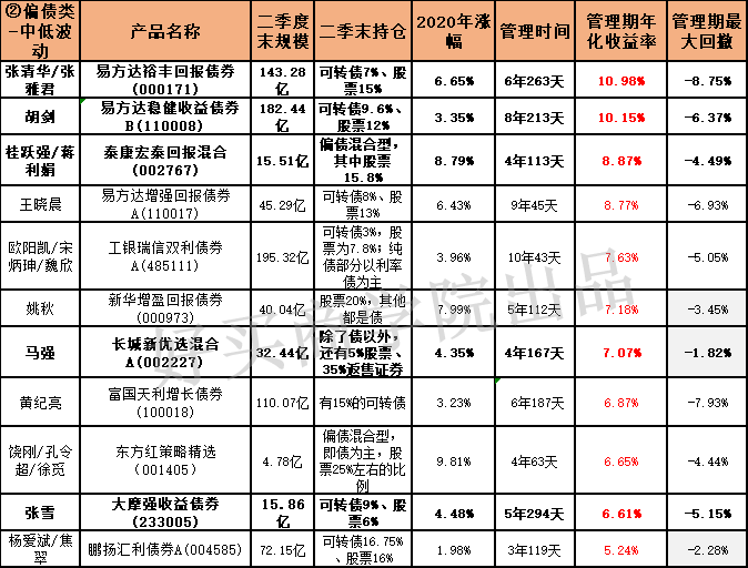这里我们做了比较大的精简,有些类似第二部分中低波动偏债,就全部剔除了,保留了波动比较大的一些不错产品,适合更高风险偏好的偏债投资者。这些产品都是有一定名气的产品。比如: