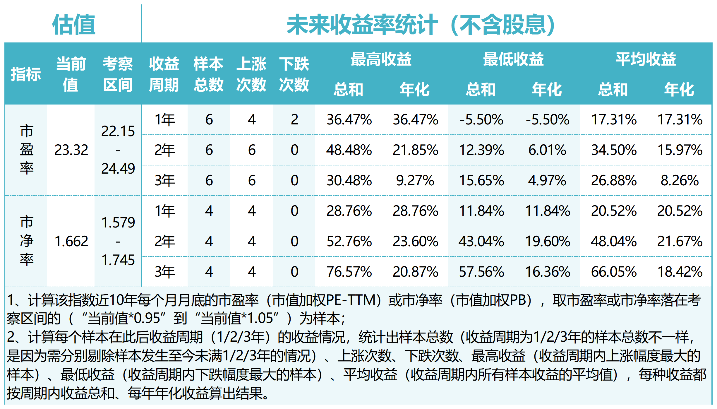 中证500当前的市盈率是23.32,我们以22.15-24.49(23.32*0.95-23.32*1.05)为市盈率考察空间。以最近10年为统计周期,从每个月月底的市盈率数据中筛选出落在22.15-24.49间的样本,然后统计每个样本在未来1年、2年、3年内的收益情况。