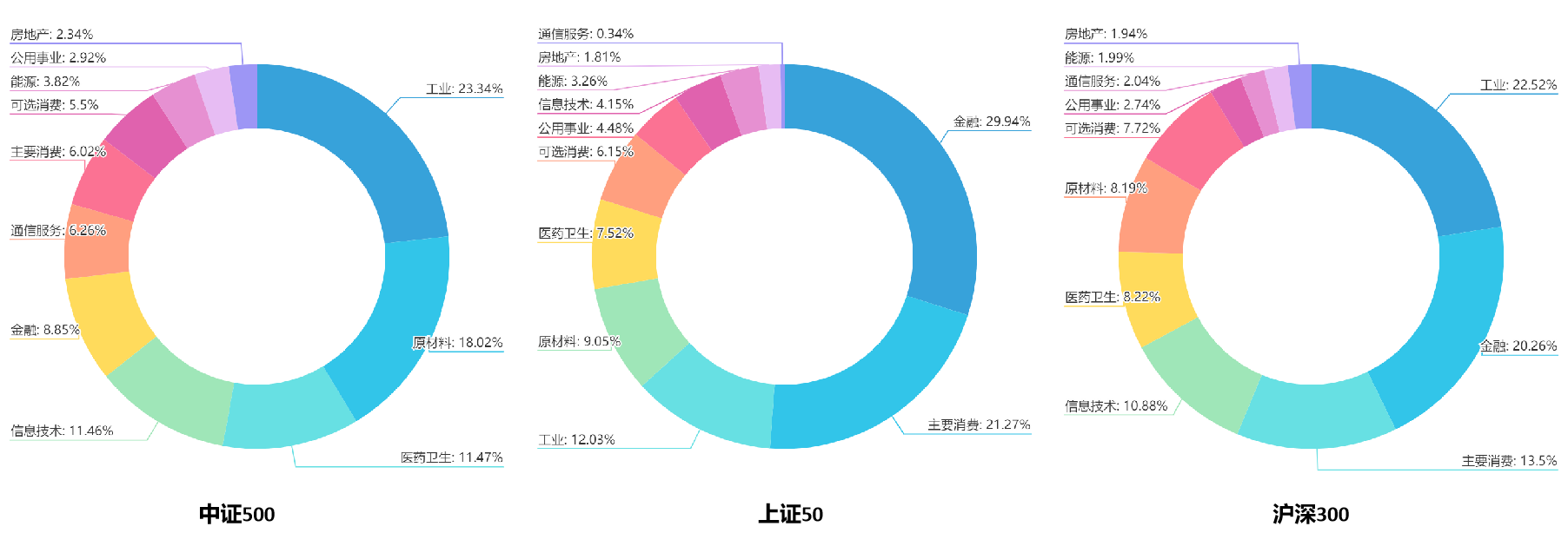 从中证500的最新行业分布来看,在11个中证一级行业中,工业、原材料、医药卫生、信息技术的占比都超过10%,其中工业达到了23%。而在上证50、沪深300中占据了高权重的金融和主要消费的权重都下降到10%以下,取而代之的是原材料和医药卫生的权重大幅提升。