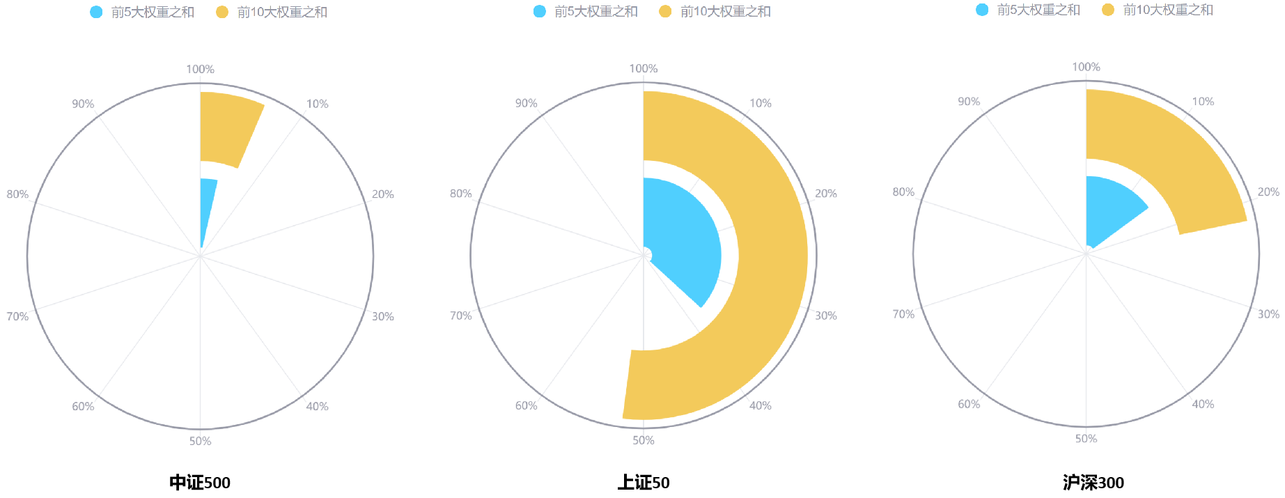 从成分股集中度来看,中证500的前5大权重股之和是3.6%,前10大权重股之和是6.43%。比起上证50、沪深300,中证500的成分股集中度大幅下降,指数中没有占据绝对优势的股票,不会出现几支股票就决定指数走势的情况。