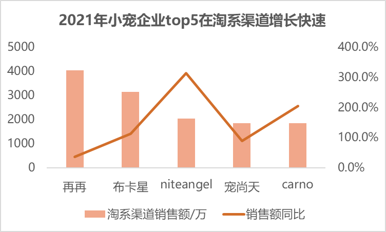 小宠物行业规模接近百亿元,增长非常快速,以仓鼠类目为例,其近四年复合增长率超过20%。可以看到在淘系平台销售额排名前五的企业,在2021年都保持了30%-300%的增速。