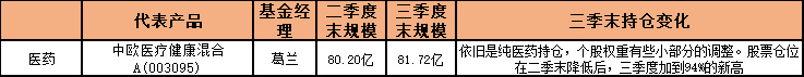 葛兰的中欧医疗健康混合A(003095)三季度持仓看,依旧是纯医药持仓,个股权重有些小部分的调整。股票仓位在二季末降低后,三季度加到94%的新高。