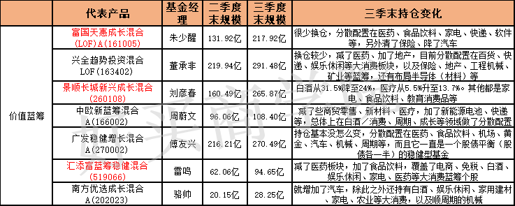 在规模上看,景顺长城新兴成长混合(260108)增加了100亿(累计规模达到265亿),富国天惠成长混合(LOF)A(161005)也增加90亿(累计规模达到217亿),兴全趋势投资混合LOF(163402)增加70亿(累计规模达到291亿),广发稳健增长混合A(270002)增加54亿(累计规模达到270亿),汇添富蓝筹稳健混合(519066)也增加30亿(累计规模达到近95亿)。