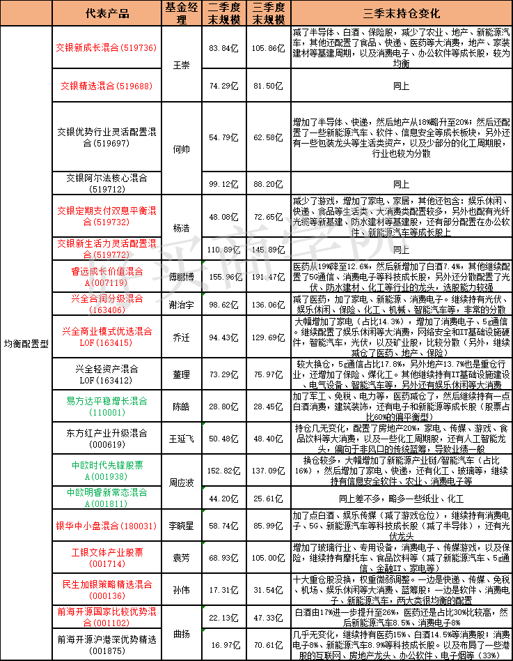 总结来看,作为风格均衡配置、还有做轮动型,这些基金的持仓变化就比较复杂了,在消费、蓝筹、成长类之间灵活切换,有增有减,可以具体看它们的持仓明细。