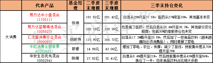 刘彦春的景顺长城新兴成长混合(260108)三季度持仓看,白酒从31.5%降至24%,医疗从5.5%升至13.7%。其他都是家电、食品饮料、教育消费品等。