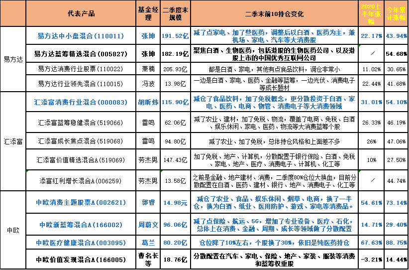 易方达方面,张坤的代表性产品易方达中小盘混合(110011)二季度减了点家电、加了些医药,调整后以白酒、医药为主,兼机场、家电、汽车等大消费股;它的另一个产品易方达蓝筹精选混合(005827)其实是一个沪港深基金,聚焦白酒、生物医药,不仅包括A股公司,还包括港股的生物医药公司、以及港股上市的中国优秀互联网公司,两只基金今年的收益都非常不错,也是长期值得投资的品种。张坤的另一个优势是,他的产品历史波动相对同行会更小。萧楠仍旧聚焦在白酒、家电,变化较小,业绩一般。冯波一边是消费蓝筹,一边光伏、消费电子等成长题材,业绩也还可以。