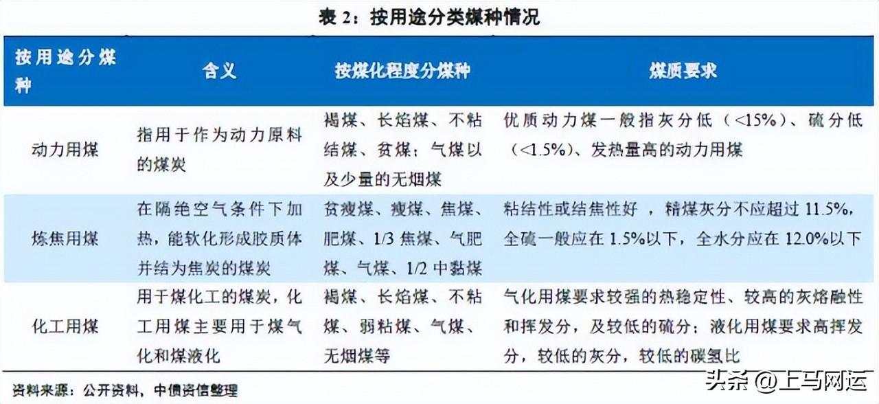 根据煤炭用途可分为动力用煤、炼焦用煤和化工用煤,其中传统的化工用煤一般为无烟煤,但随着技术革新和新型煤化工的兴起,部分烟煤逐渐被用于化工原料,但本文仍以无烟煤来指代化工用煤。具体见表2。