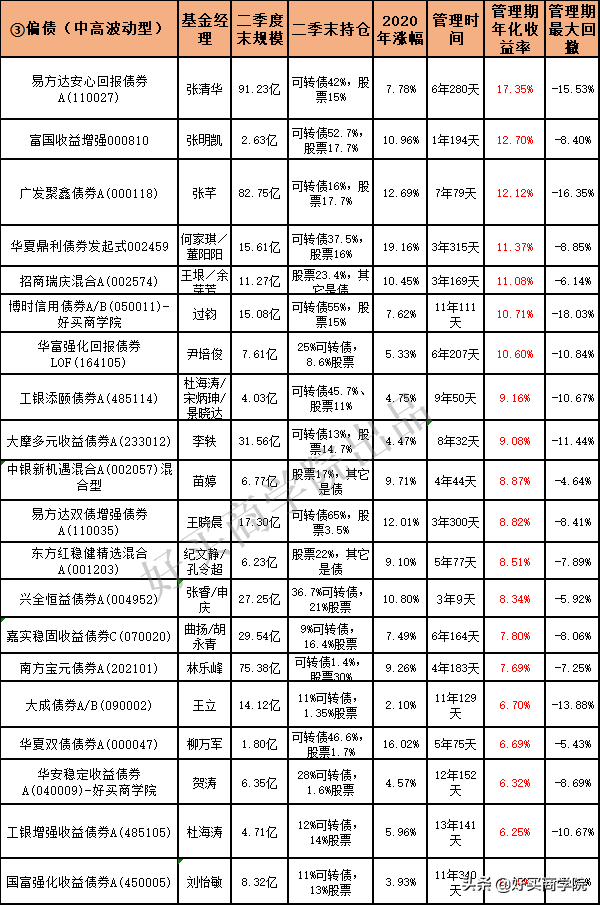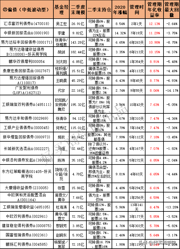 接下来年化超过7%的,欧阳凯/宋炳珅/魏欣的工银瑞信双利债券A(485111)也是规模高达195亿,欧阳凯管理的10年间,股债切换择时非常精准,15逃顶、16年加仓、18年轻仓后抄底都非常厉害,所以大跌一次都没碰上。张清华的易方达丰和债券(002969)成立以来全部正收益。何秀红的工银产业债债券A(000045)规模也是高达115亿,成立以来仅16年微亏。姚秋的新华增盈回报债券(000973)每年都是正收益。马强的长城新优选混合A(002227),散户持有为主,业绩非常强劲、平均,管理四年多最大回撤才-1.82%。
